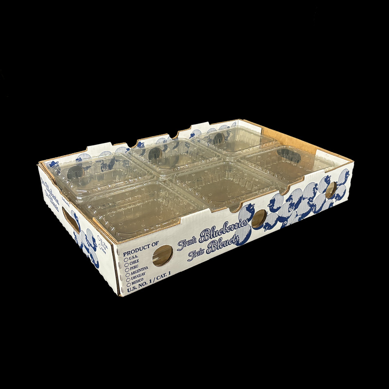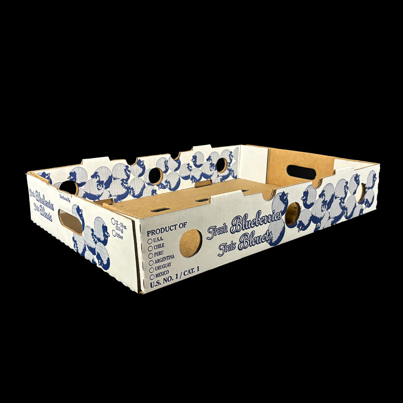 A5487 is a corrugated produce box featuring a white exterior with stock blueberry graphics. Designed with an open top, it holds twelve 18-ounce blueberry clamshells and offers secure packaging and efficient handling during transport, storage, and display. The box includes hand holes for easy handling, venting to maintain freshness, and stacking tabs and receptacles for stable stacking.